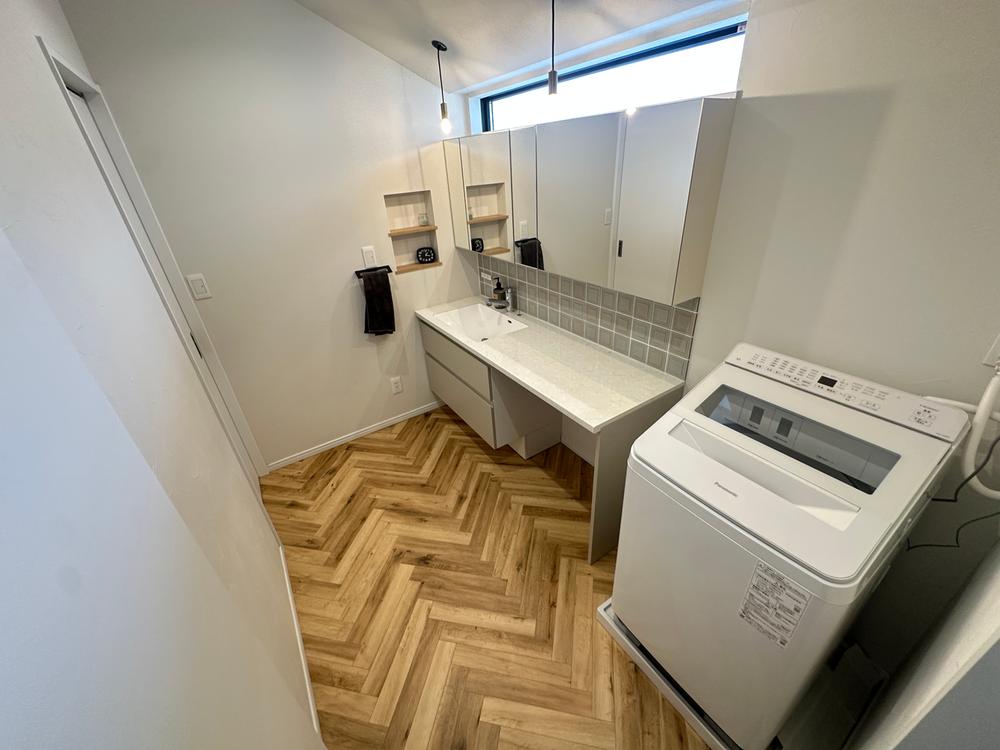 毎日の身支度が楽しくなる、ホテルライクな洗面空間。憧れのヘリンボーン柄の床と、タイル使いが目を引くワイドな洗面台が魅力です。横幅にゆとりがあるため、忙しい朝も家族並んでスムーズに準備が整います。