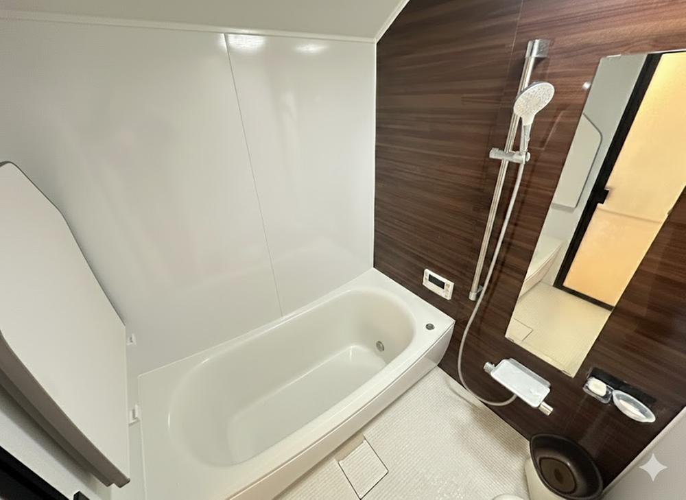 心身ともにリラックスできる、落ち着いた雰囲気の浴室。艶やかな木目調のアクセントパネルが、1日の疲れを癒やす上質なバスタイムを演出します。ゆったりとした浴槽で、贅沢なリラックスタイムをお過ごしください。