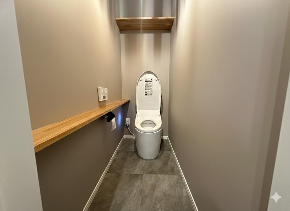 洗練されたタンクレストイレ。 落ち着いた色調のクロスと木目調のカウンターが、清潔感あふれるモダンな空間を演出します。スッキリとしたデザインでお掃除もしやすく、日々の暮らしに心地よさを提供します。