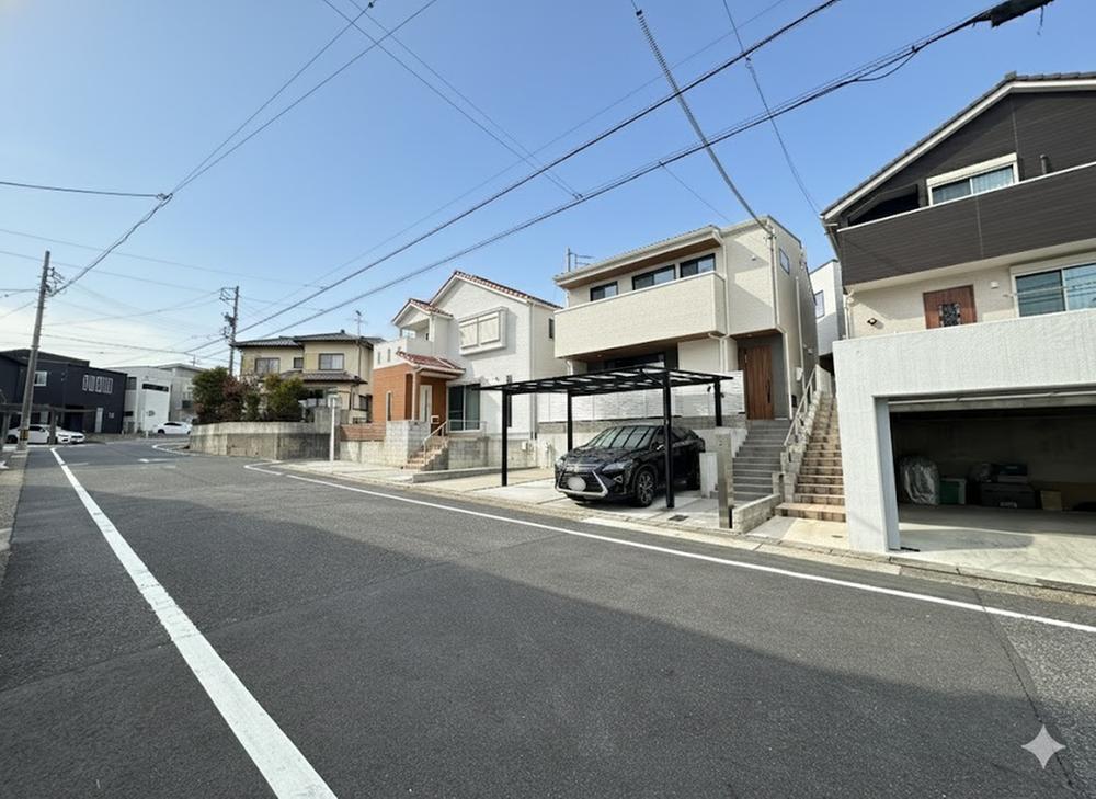 ゆとりある前面道路と、開放的な街並み。 高台に位置するため陽当り・通風ともに良好で、開放感あふれる暮らしが叶います。カーポート付きの駐車場は、雨の日の荷物運びや大切なお車を守る際にも心強い設備です。
