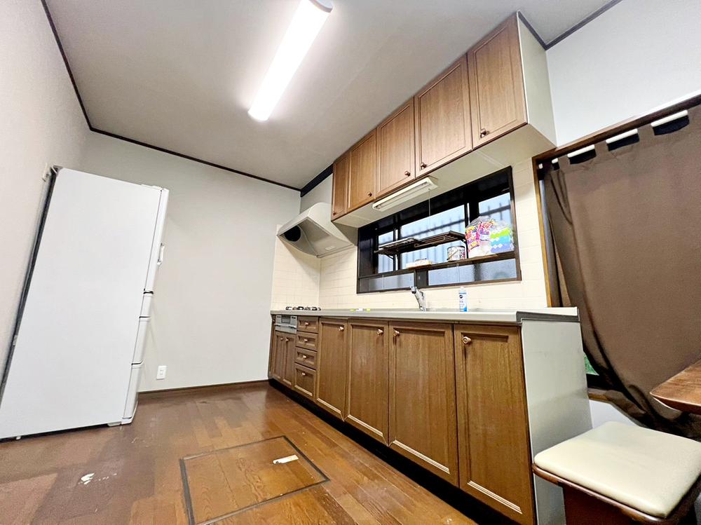 【キッチン】収納付キッチンでフライパン・パスタ鍋・圧力鍋の出し入れが便利です。作業台はお手入れがしやすく、また幅が広いのでお子さまといっしょにお料理することも可能です。窓のある明るいキッチンです!