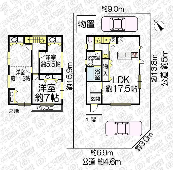 | 土地権利 | 所有権 | 私道負担・道路 | 無、南西4.6m幅(接道幅6.9m)、南東5m幅(接道幅13.8m) | ||