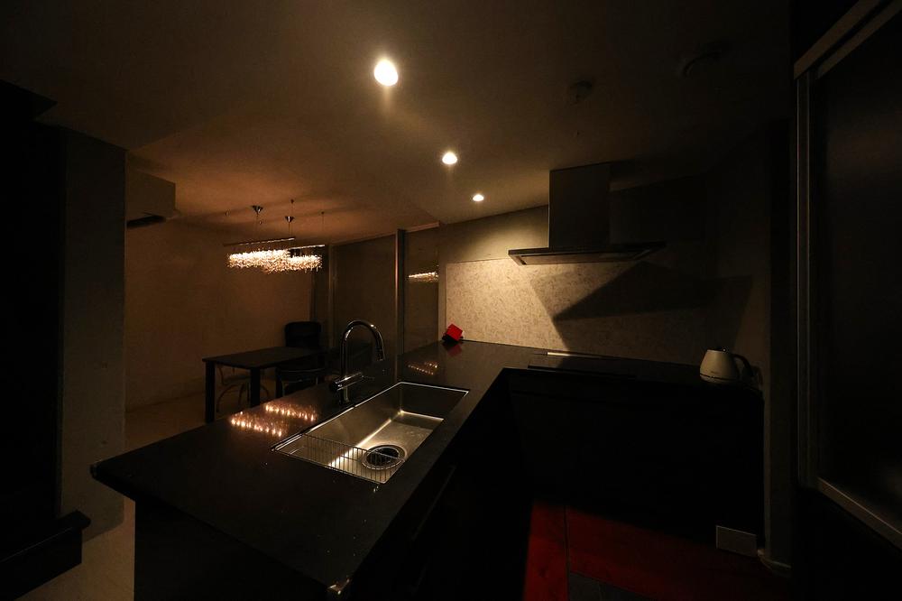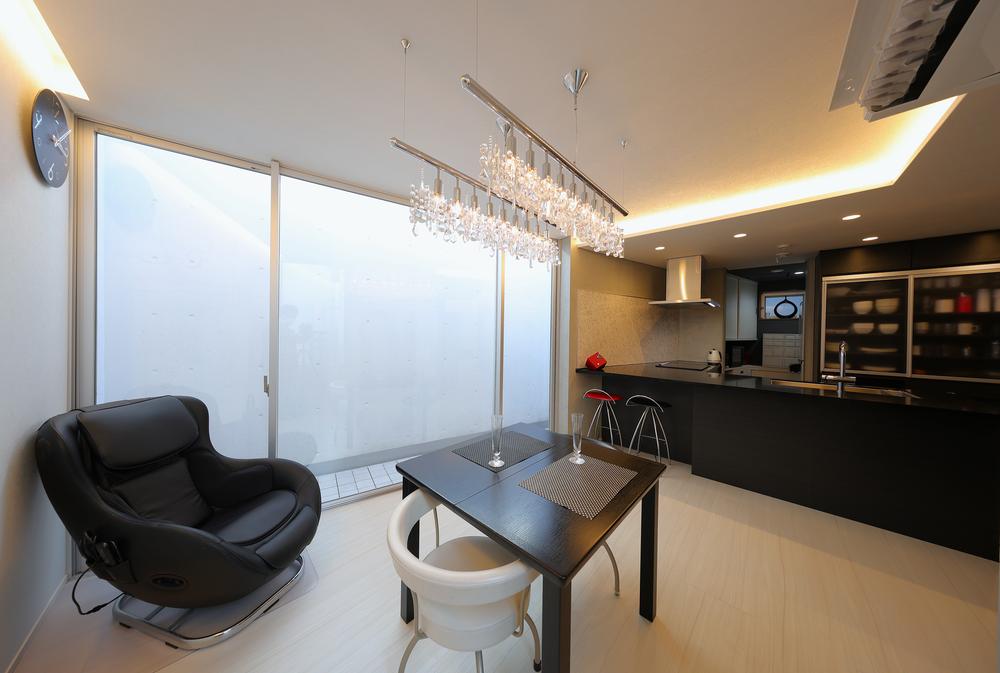 照明を落とすこともできるダイニング。特別な時は特別な照明で雰囲気を出すのも良いかと思います。ぜひ夜にいらして雰囲気を見てください。