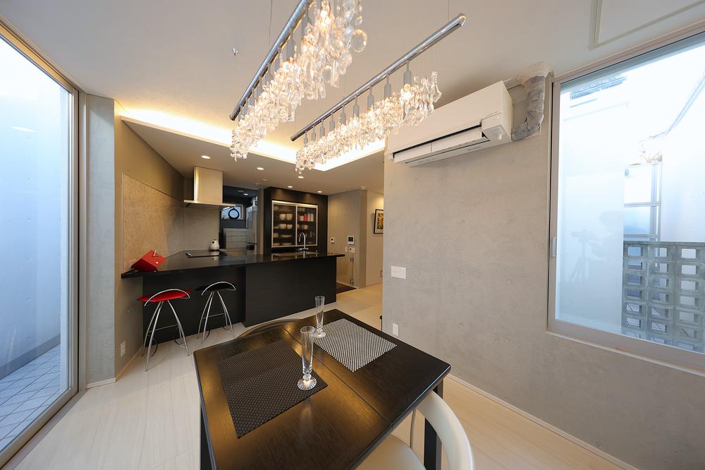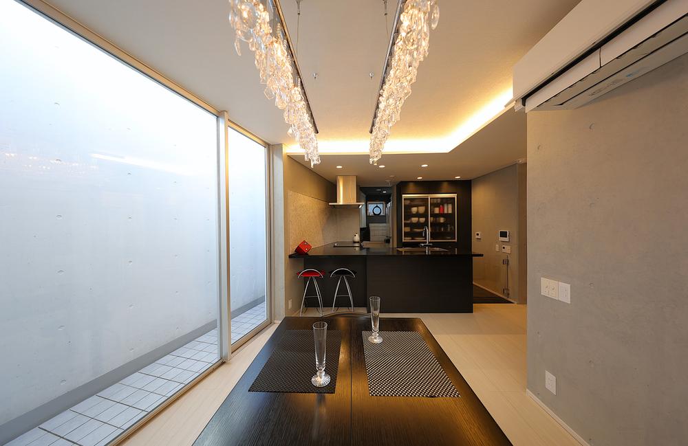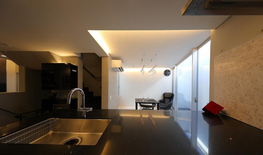 一体感あるキッチンとダイニング。お客様が来た際お料理をしながら会話に参加できます。また、外断熱とすることにより、室内のコンクリート打ち放しが重厚感を演出し蓄熱体としても機能し温度変化を緩やかにします。