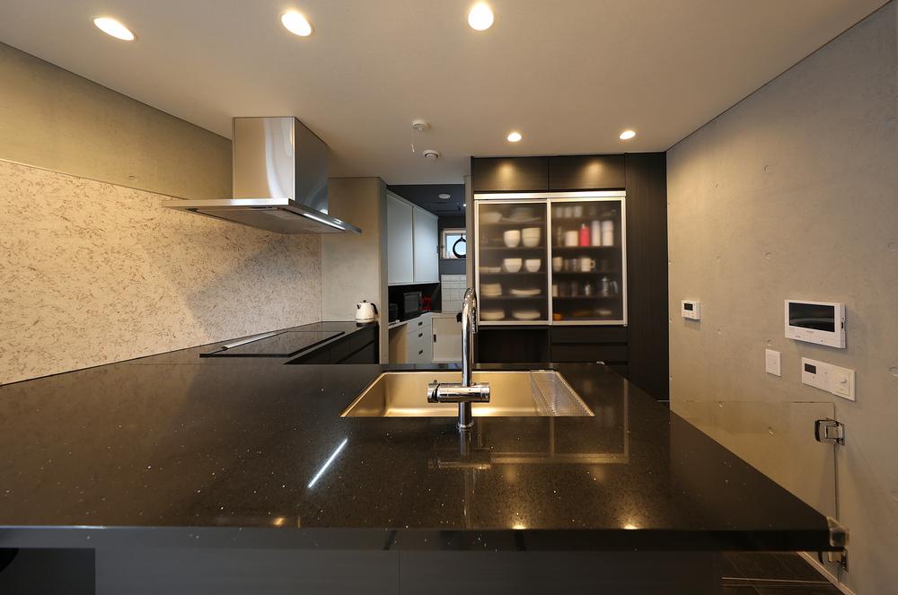 夜空に星を散りばめたようなキッチンの天板。この天板が一番映えるようにキッチンを設計してもらいました。また、一戸建てでは珍しい骨も砕くディスポーザーを設計段階から配慮して設置し生ゴミとは無縁になりました