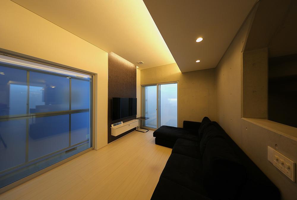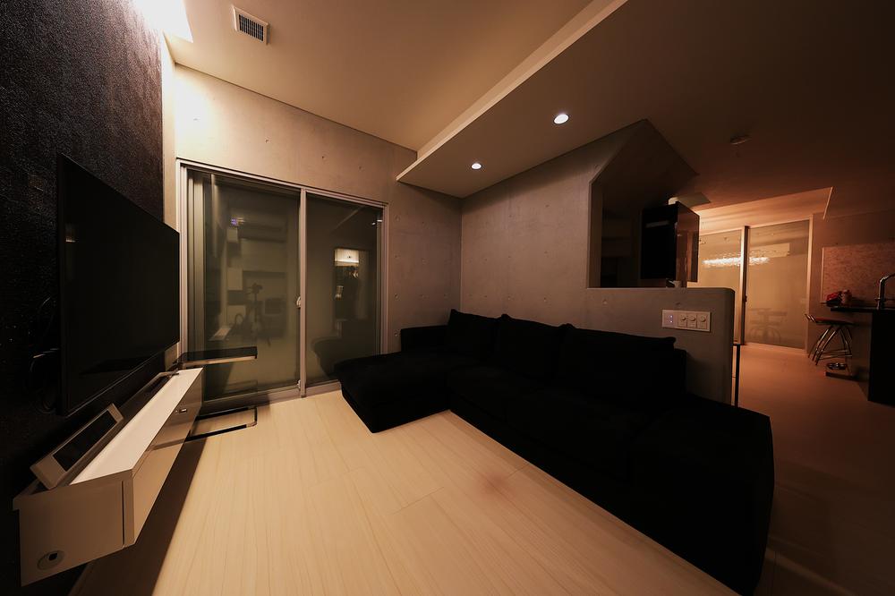 利用するスタイルに合わせ照明を自在に変更でき、防音仕様のリビング。ソファーで寛ぐ、本を読む、TVを見る、映画を見る等それぞれで色味含めて照明を自在に変えられます。
