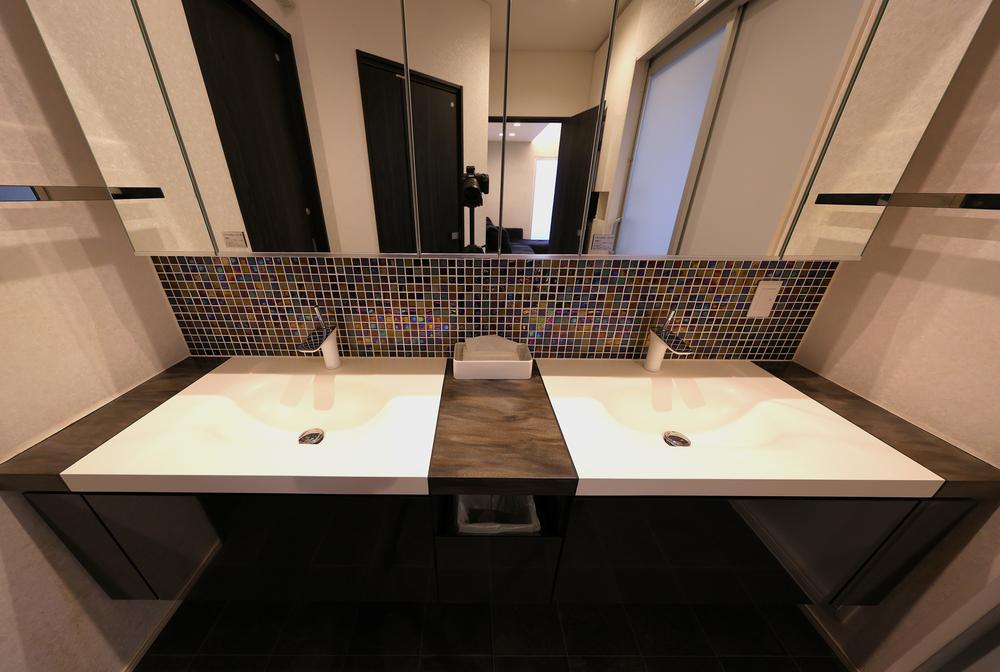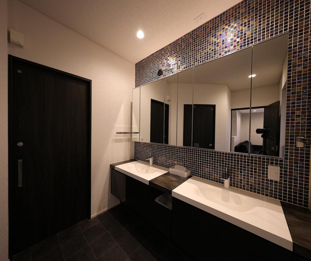 全面モザイクで高級感を演出した造作洗面台。一日の始まりの朝、きれいな空間で身支度全てを整え気分をあげて。(同一空間内にウオークインクローゼットあり)