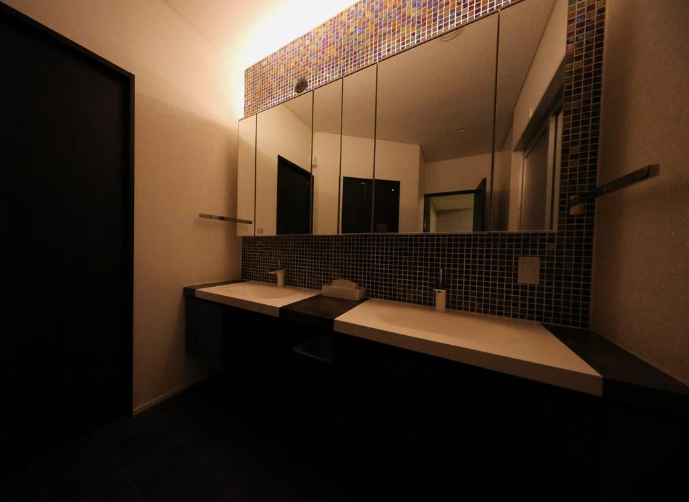 モザイクタイルを多くあしらい配色に拘ったオーダー洗面化粧台。画像では表現しきれない陰影をぜひみてください。