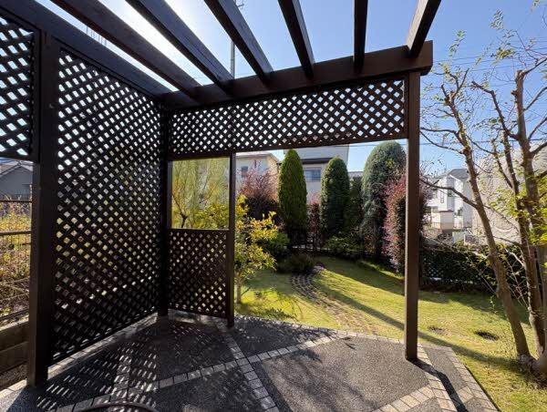 リビングから直接つながるパーゴラ付きテラス。ラティスにより視線を程よく遮り、庭の緑を眺めながら洗濯物干しや休憩など、日常の動作を効率的に行いやすい屋外スペースです。