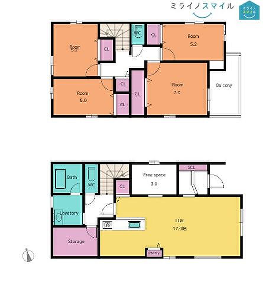 | 建物構造 | 木造/2階建 | 間取り詳細(帖) | リビングダイニングキッチン 17帖(1階)収納(1階)洋室 7帖(2階)洋室 5.2帖(2階)洋室 5.2帖(2階)洋室 4.5帖(2階) | ||