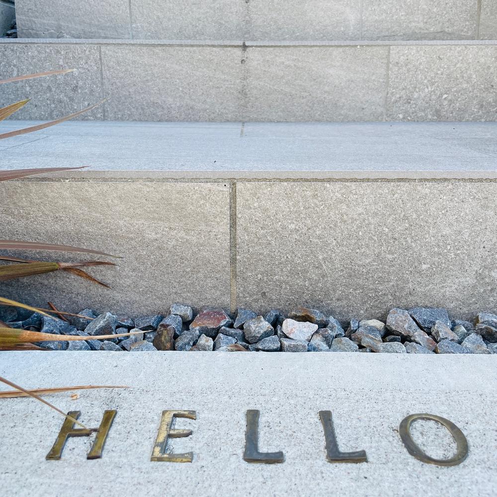 玄関前の装飾として、アクセントとしても人気の真鍮レター。階段下にさりげなく「HELLO」の文字が埋め込まれています。(2025年11月撮影)