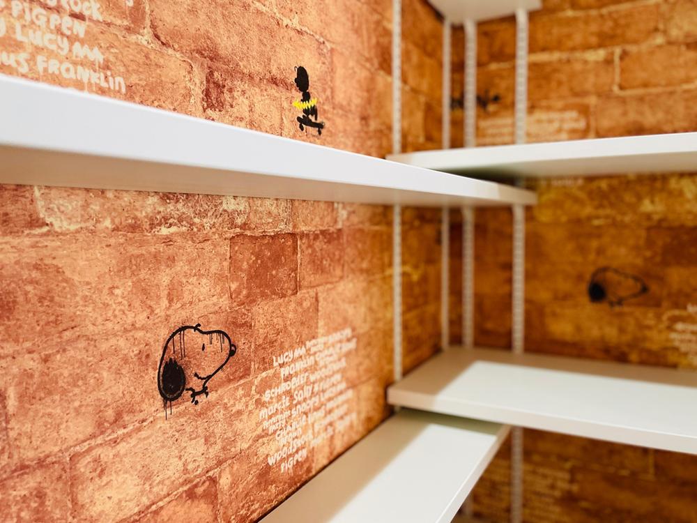 外観はシックに、内装はシンプルにまとめられていますが、プライベートな空間にはちょっとした遊びごころも。パントリーの壁紙はさりげなくスヌーピー柄です(2025年11月撮影)