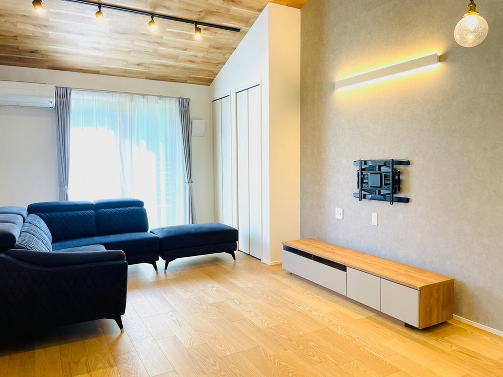 陽当たりが良く明るいリビングダイニング。TVを壁掛けにできるよう金具が設置されています。リモコンで開閉できる電動シャッター、足元から暖かい床暖房など設備も充実しています(2025年11月撮影)