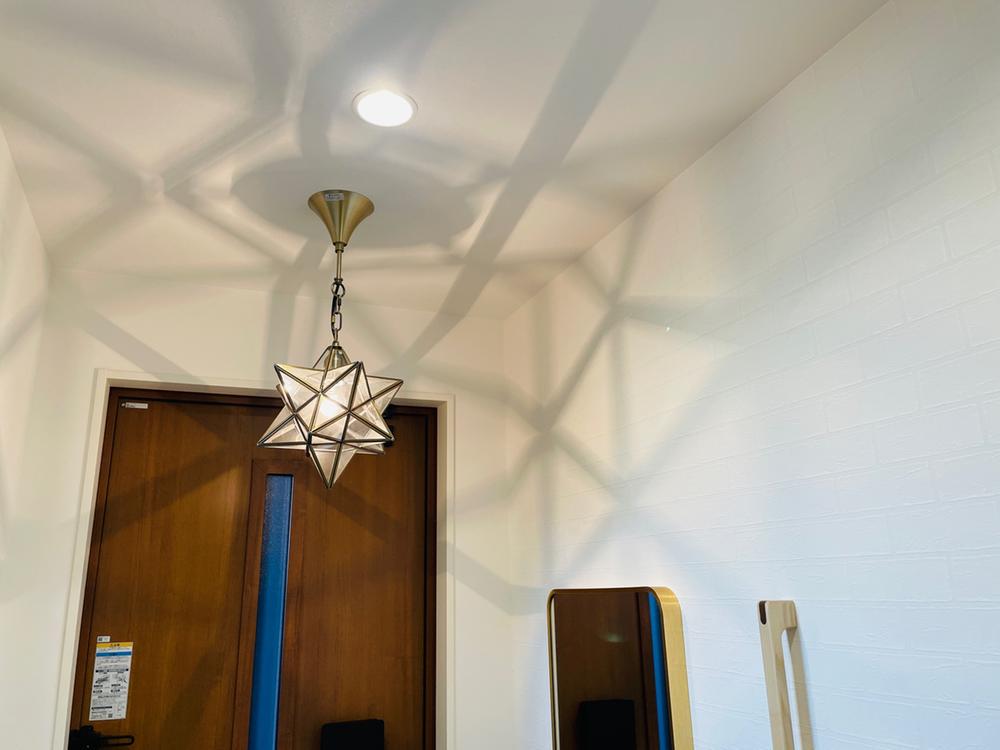 殺風景になりがちな玄関周りに遊びごころのある照明を設置しています(2025年11月撮影)