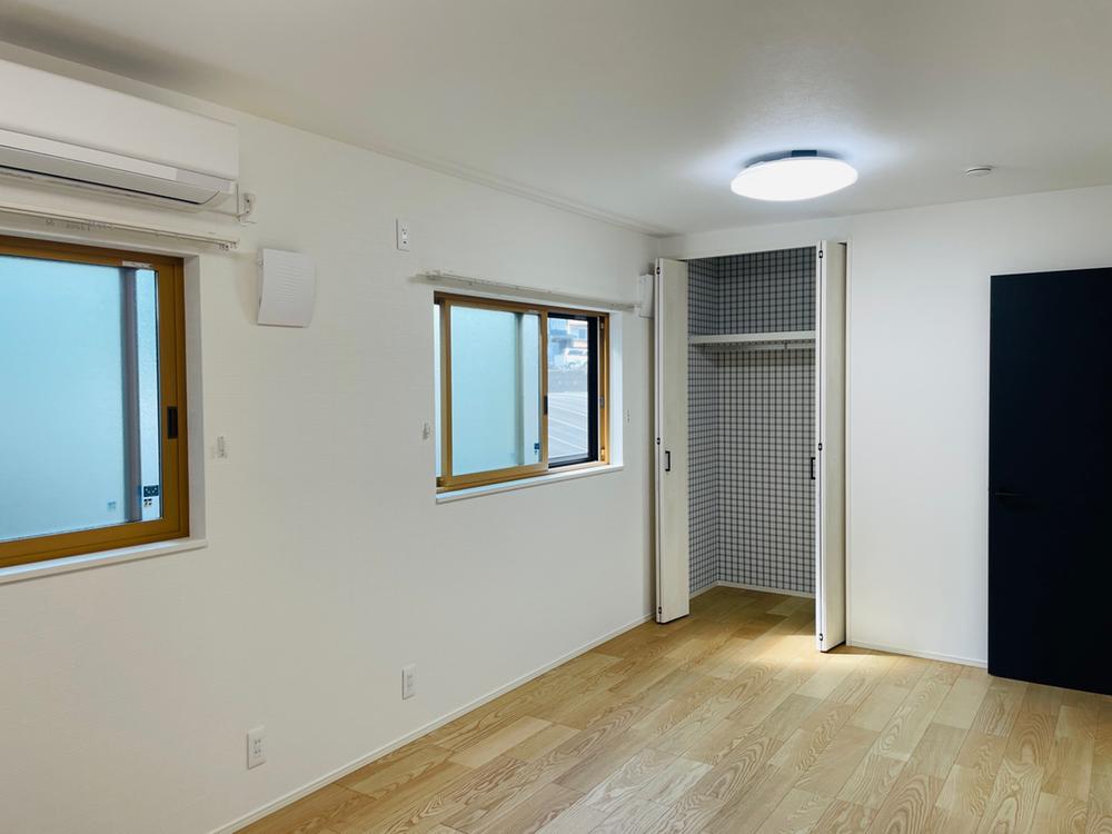 真ん中の洋室は現況約9帖の広い一室ですが、扉・窓・換気口・クローゼットが2対配置されていて、真ん中に壁を作ればそれぞれが独立した居室になるよう設計されています(2025年11月撮影)