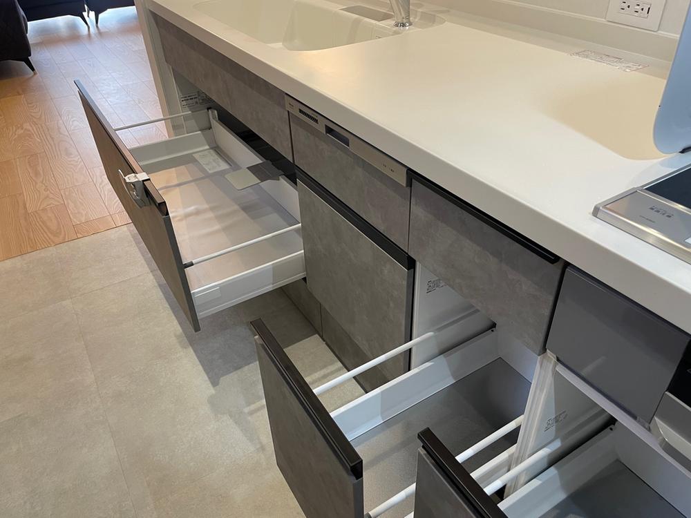 備え付けの食洗機は深型タイプで背の高いグラスも洗えます。引き出しの中板はお掃除しやすく防虫効果のあるステンレス素材です(2025年11月撮影)