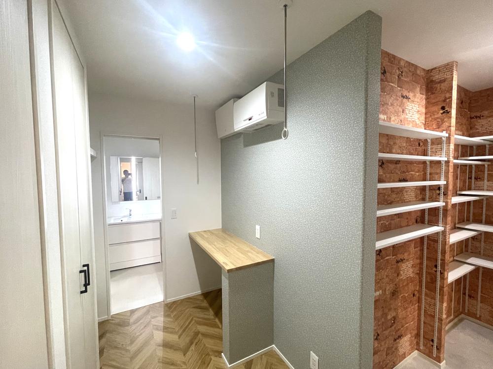 洗面⇔ランドリールーム⇔キッチン⇔パントリーがシームレスにつながる便利な家事動線。広めのランドリースペースはとても使い勝手がよさそうです(2025年11月撮影)