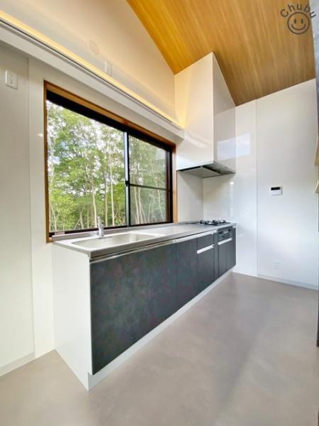 スライド収納タイプのシステムキッチンで収納量が豊富!家族と一緒にお料理することができるゆったりしたキッチンスペースです!キッチンまわりは動きやすさを重視した導線でスムーズな家事の手助けになります!