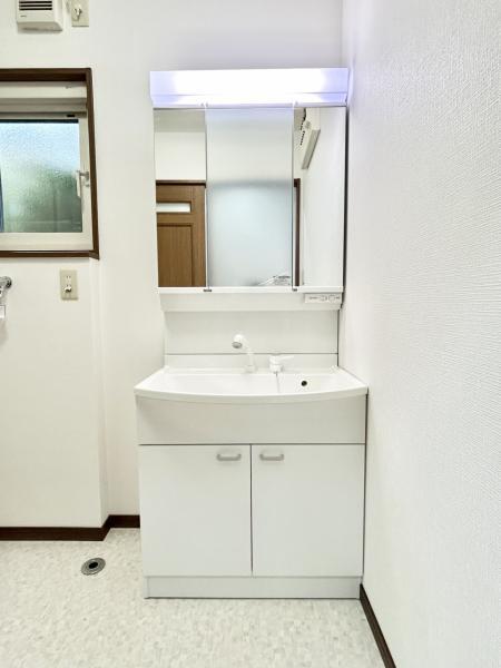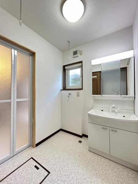 【リフォーム済】洗面所を撮影いたしました。床はクッションフロアを張り替えましたので、清潔な印象になりました。