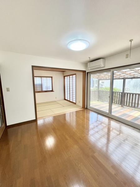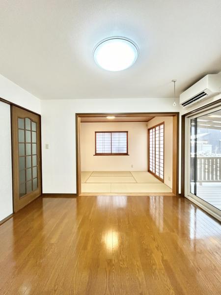 【リフォーム済】リビングから隣接している和室に向けて撮影しました。ふすまを開ければ親戚やお客様がたくさん来たときにも便利な広さがありますね。