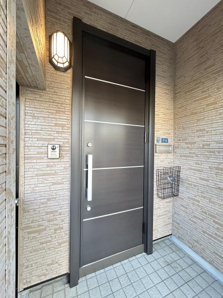 【リフォーム済】玄関を撮影しました。玄関扉を新品に交換しました。設置されているカラーモニター付きインターフォンで、玄関にいらしたお客様を確認してから応対できます。