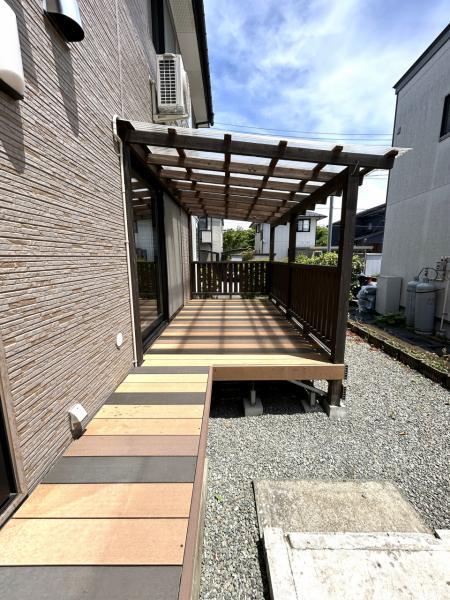 【リフォーム済】敷地南西側ウッドデッキを撮影しました。ペットの散歩やゴミ出し等での出入り等、使い勝手が良さそうですね。