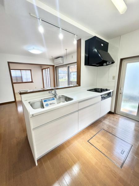 【リフォーム済】新品交換したハウステック製のキッチンを撮影しました。対面型なので、ご家族と会話しながらお料理を楽しめますね。床下収納もあるので、何かと便利ですね。