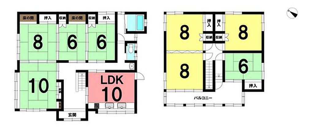 | 建物構造 | 木造/2階建 | 間取り詳細(帖) | リビングダイニングキッチン 10帖(1階)和室 10畳(1階)和室 8畳(1階)和室 6畳(1階)和室 6畳(1階)洋室 8帖(2階)洋室 8帖(2階)洋室 8帖(2階)和室 6畳(2階) | ||