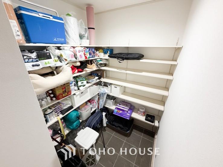 【シューズインクローゼット】収納力のあるシューズインクローク。土足のまま入れるので、ゴルフバックやお子様のスポーツ用品などがそのまま収納可能。靴や傘などもそちらに収納することで、散らかりがちな玄関をすっきりと保てます。