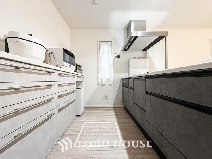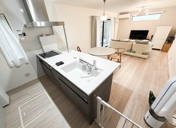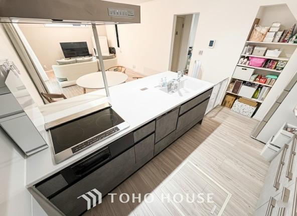 【会話も弾みます】キッチンは収納数もさる事ながら、リビングで寛ぐ家族や小さなお子様を見守りながら料理が出来る「対面式の温もり設計」。キッチンから立ち込める香りが今日の料理を期待させます。