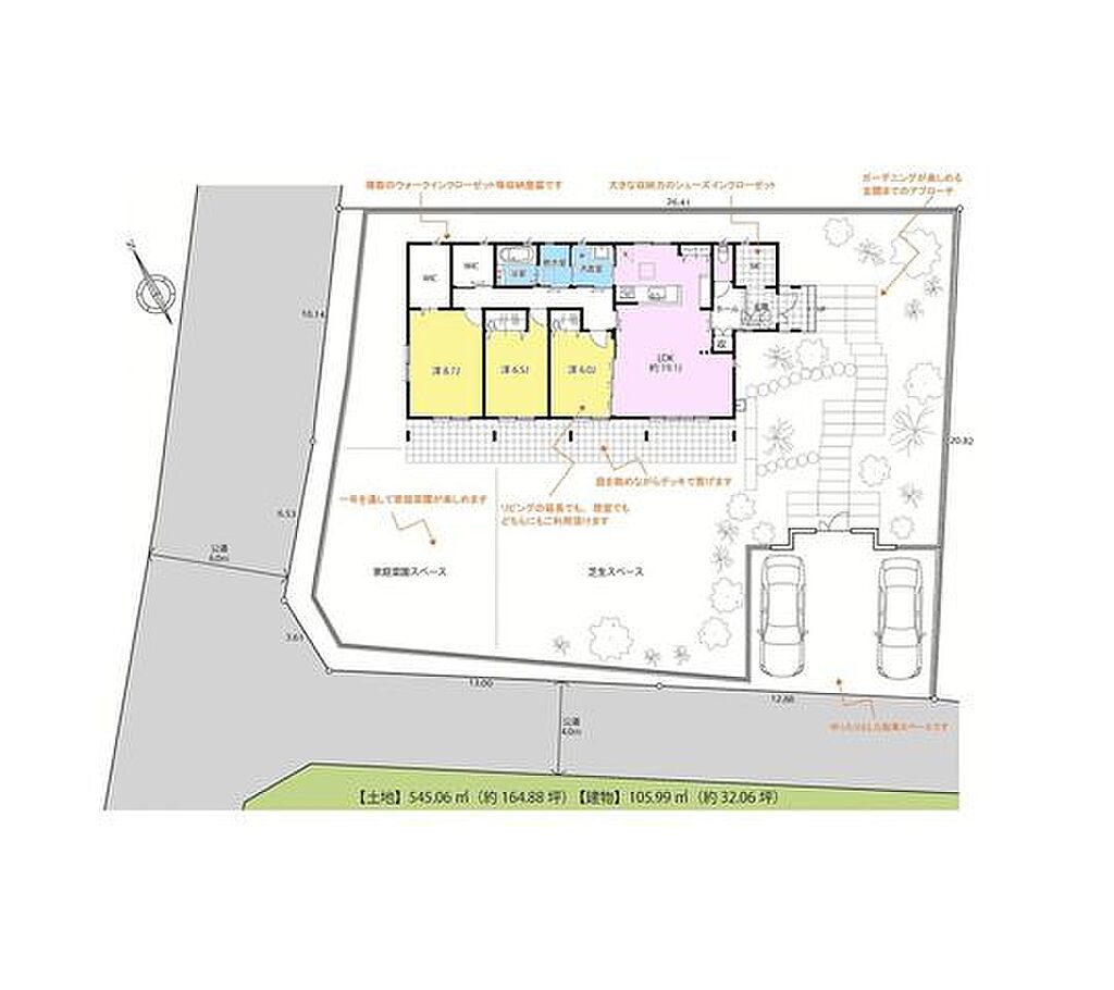 | その他 | 所有権、木造、LDK15帖以上、全室フローリング、オンライン相談可、平屋、低層住宅地、子育てに便利な施設が充実、即入居可、全居室収納、シューズボックス、クローゼット、駐車場あり、駐車場2台以上、見学可能、シューズインクローゼット、現地内覧可能、前面道路6m以上 | ||||