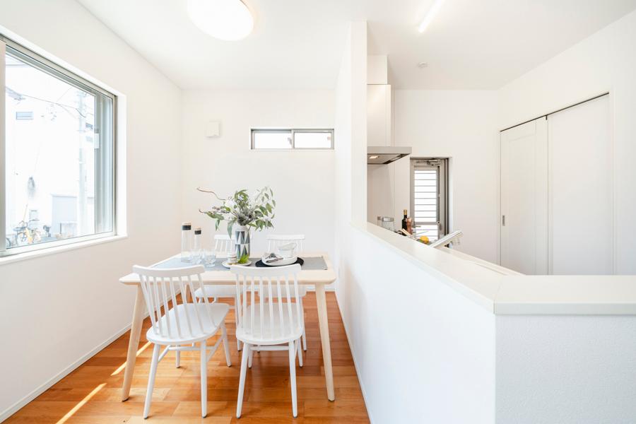 【LDK/約18.1帖】やわらかな光が差し込む2面採光のダイニング。カウンター付きのキッチンは、配膳や後片付けをスムーズにする便利なスペースです。※2025年8月撮影