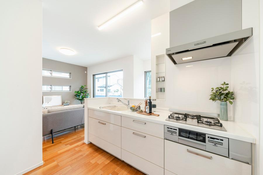 【キッチン】家族の気配をいつも感じられる、対面式のハイオープンキッチンを採用。家事をしながら家族とのコミュニケーションが図れ、毎日の家事が自然と心地よい時間に変わります。※2025年8月撮影