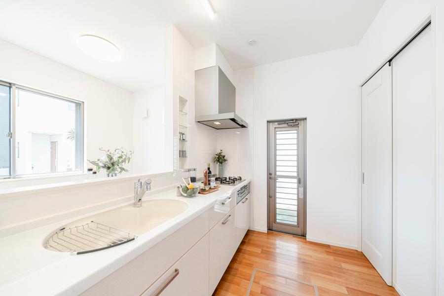 【キッチン】勝手口からも陽光が注ぎ込む明るいキッチン。食材や飲料などのストック置き場として重宝する、扉付きの可動棚を設置しました。キッチンまわりをすっきりと整頓できます。※2025年8月撮影
