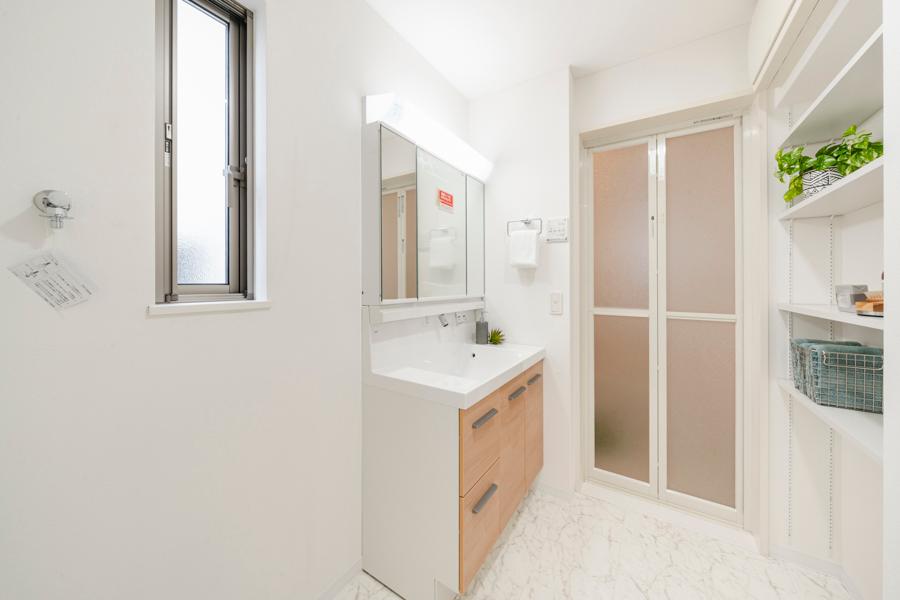【洗面室】高さを変えられる使い勝手の良いリネン棚を設置。タオルや洗剤のストックなどをすっきり収納できます。お風呂場の近くに設定しているので、使用するときにサッと取り出せます。※2025年8月撮影