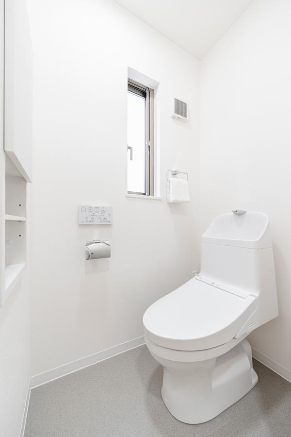 【トイレ/1階】白を基調とした清潔感のあるトイレ。温水洗浄便座付きで一年中快適に使用できます。前面に収納棚を設けているので、トイレットペーパーや掃除用具などを収納できます。※2025年8月撮影