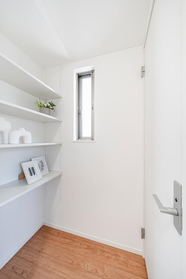 【可動棚】2階トイレの前面に可動棚を設置。小物を飾ったり家事用品を収納したりと多目的に活用できます。高さの調整も可能で、レイアウトを自在に楽しめます。※2025年8月撮影