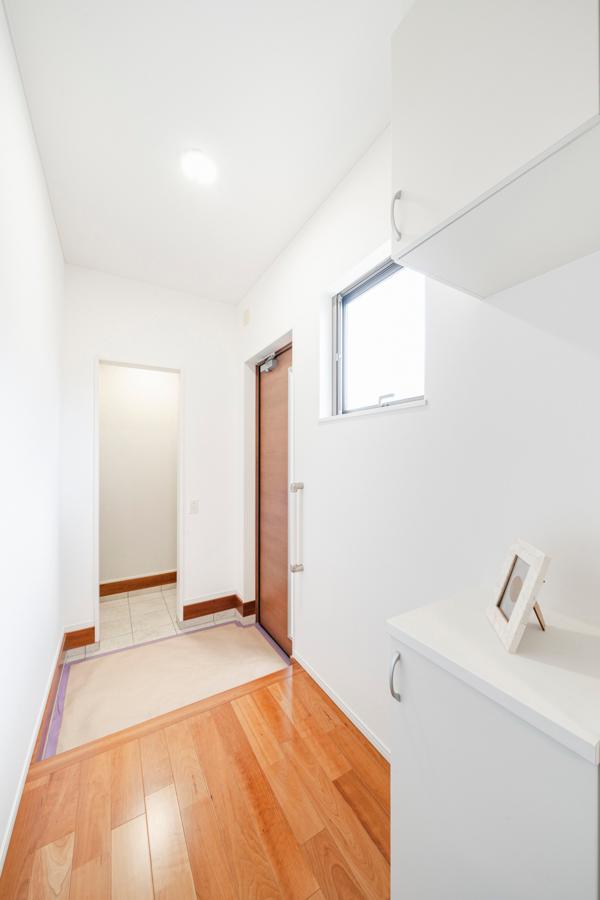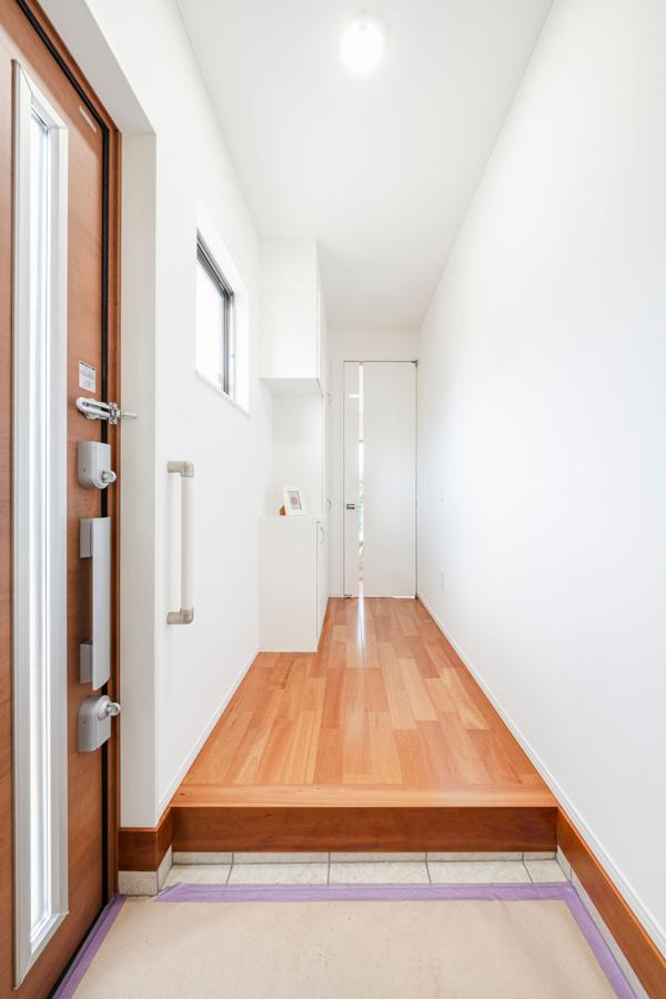 【玄関】小窓と玄関ドアのスリットから陽光が差し込む明るい玄関ホール。玄関ドアにはダブルロックの電子キーを備え、安全性を高めています。※2025年8月撮影