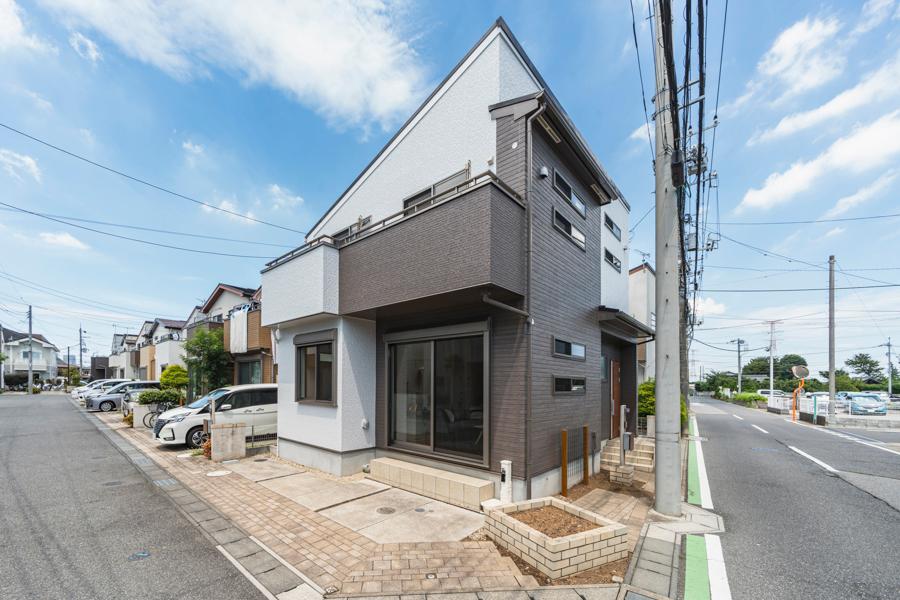 【前面道路含む現地写真】南側幅員約5.5m公道、東側幅員7.0m公道に接道。足元にはインターロッキング舗装を施し、街並みに調和する景観を実現しています。/2025年8月撮影