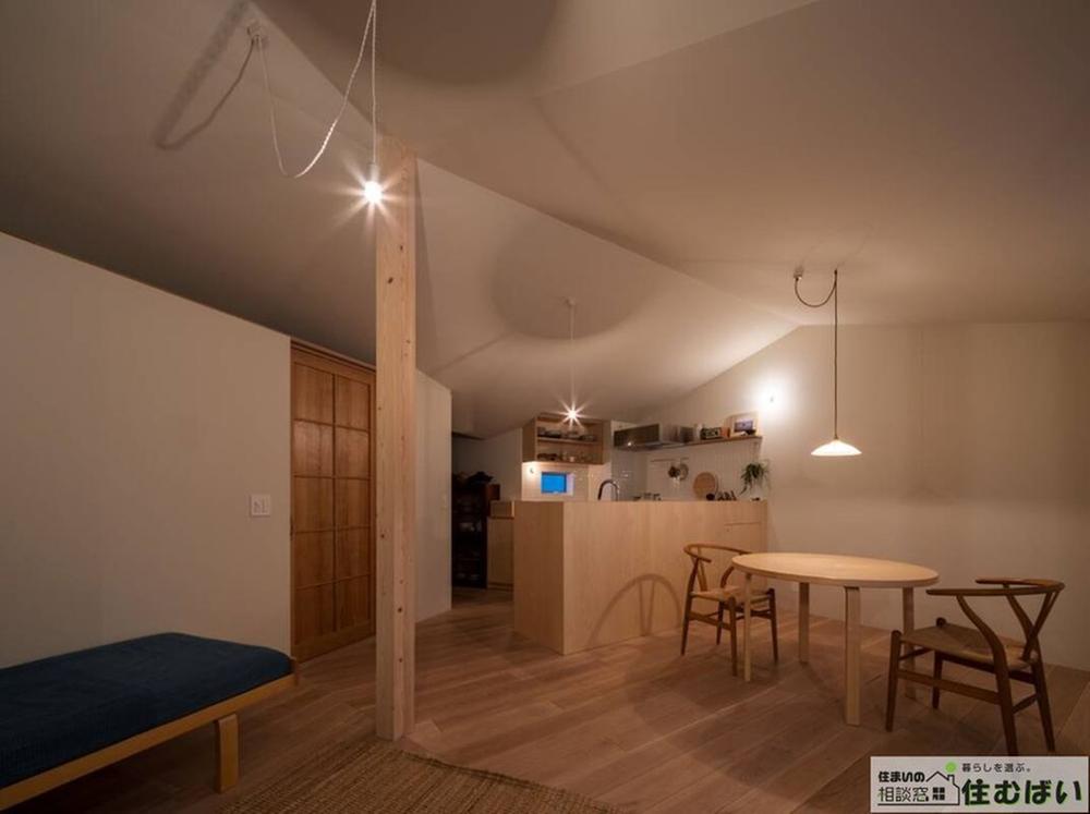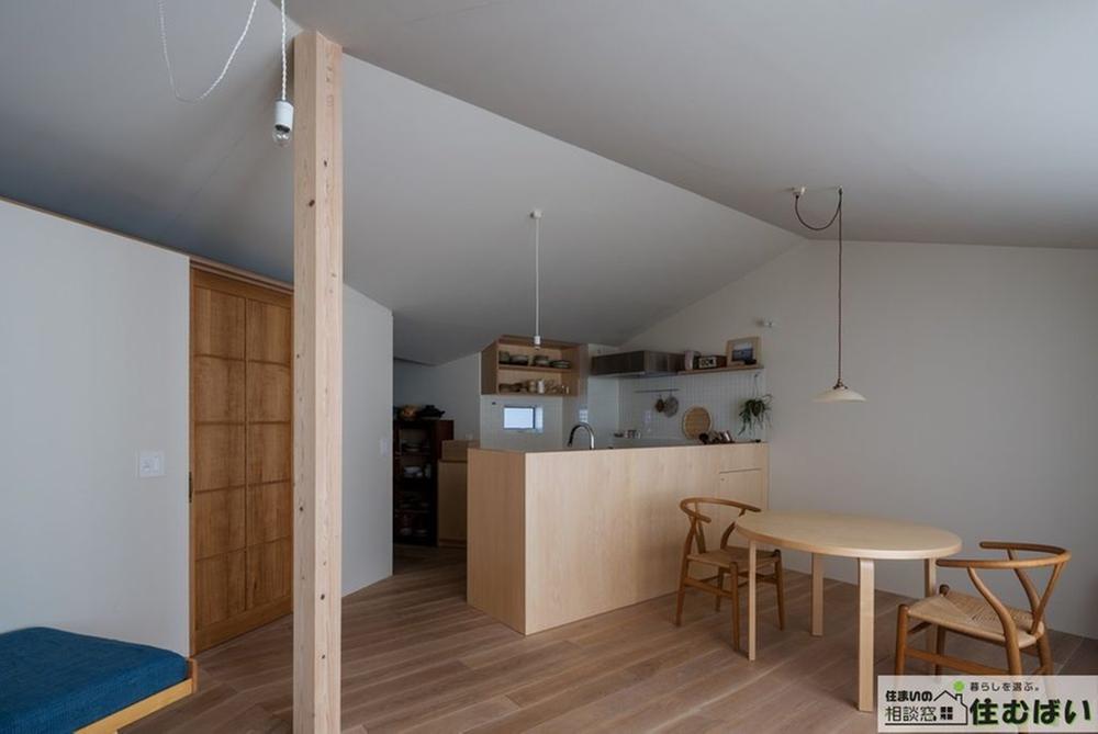 キッチン、ダイニング、リビングがゆるやかに繋がる大空間。家族の気配を感じながらも、それぞれの時間を大切にできる距離感が魅力です。木の柱が空間にリズムを生む、洗練されたインテリア。