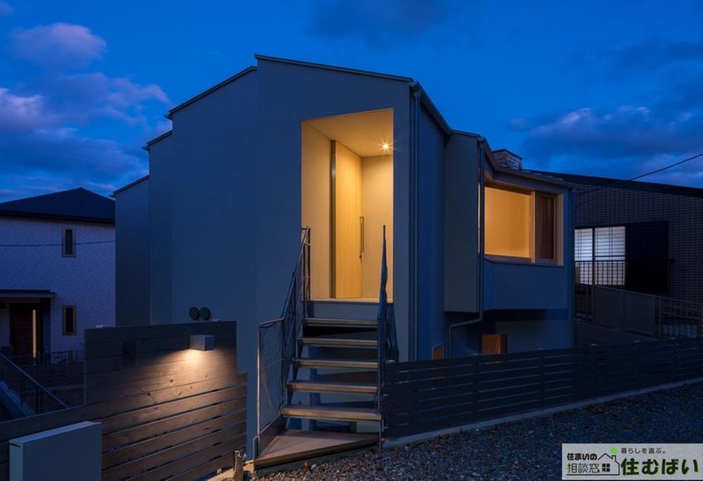 立体的な造形美が際立つ玄関アプローチ。高低差を活かした設計により、プライバシーを確保しながら開放的な暮らしを叶えます。夜には窓から漏れる温かな光が、優しく家族を迎えます☆