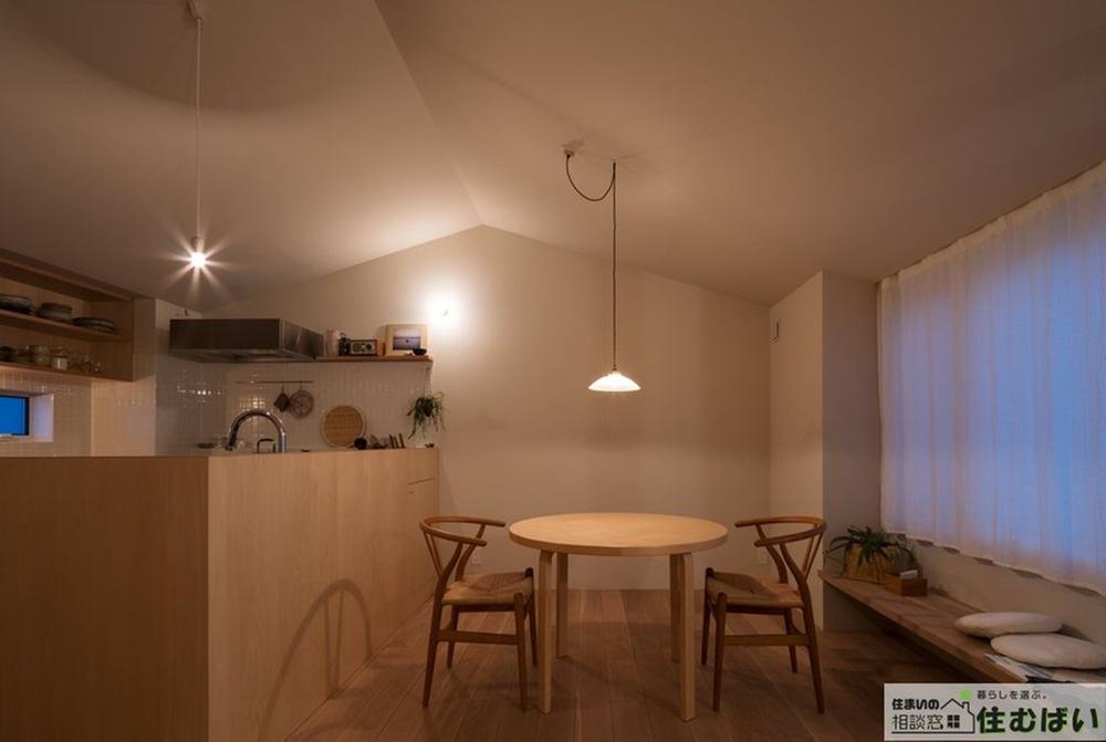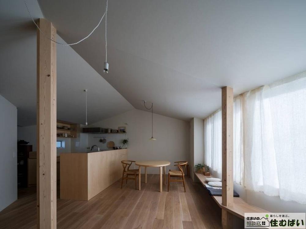 ダイナミックな勾配天井が開放感を演出するLDK。窓に沿って設けられたベンチは、お気に入りの居場所に。木の質感を活かしたミニマルなデザインが、上質な日常を彩ります。