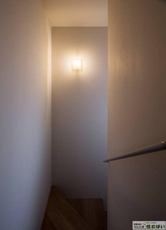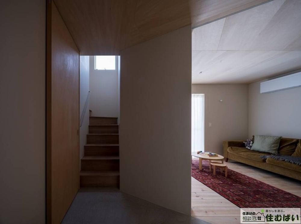 光が差し込む階段と開放的なリビングが広がります。壁の配置を工夫することで、家族の気配を感じつつも、プライベート空間とのゆるやかな仕切りを実現。奥行きと変化に富んだ、飽きのこない間取りです