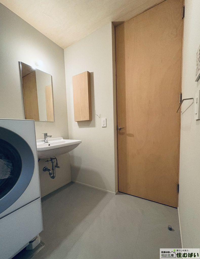 通路の奥には洗面室とお風呂を配置し、生活動線を美しく隠した設計。機能性と意匠性が溶け合う、静かな佇まいの住まいです。