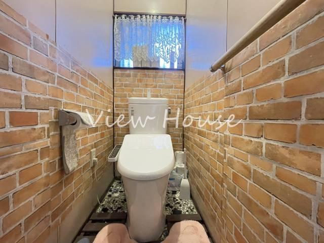 温水洗浄便座を完備した、清潔感のあるお手洗いです!レンガ調の壁紙がお洒落な雰囲気を演出しており、明るい空間に仕上がっています♪窓から外の光を取り込めるため、日中は明るく清潔感溢れる場所となっています!
