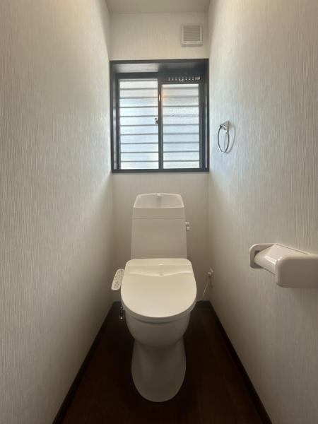 【リフォーム済】トイレです。温水洗浄付きのものに新品交換しました。です。キズや汚れが付きにくい加工が施してあるのでお手入れが簡単です。新品に交換することで、故障や水漏れのリスクが減り、安心ですね。