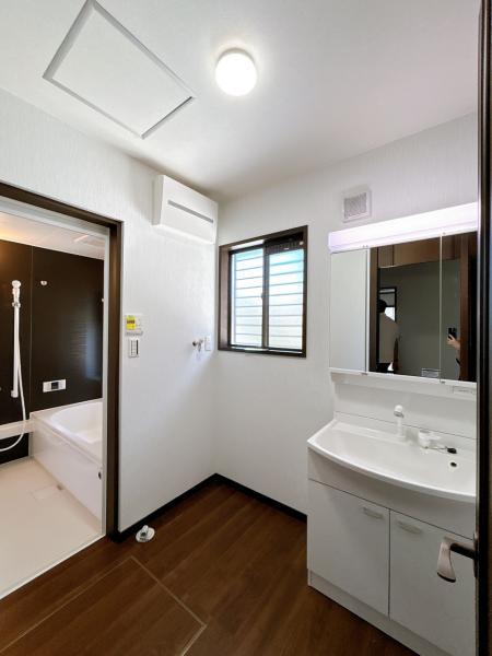 【リフォーム済】洗面所です。洗面台は新品交換しました。洗面ボウルは洗顔・洗髪はもちろん、つけ置き洗いにも使えます。収納スペースがあるので、使用しないものを洗面化粧台内に片づけておくことができます。