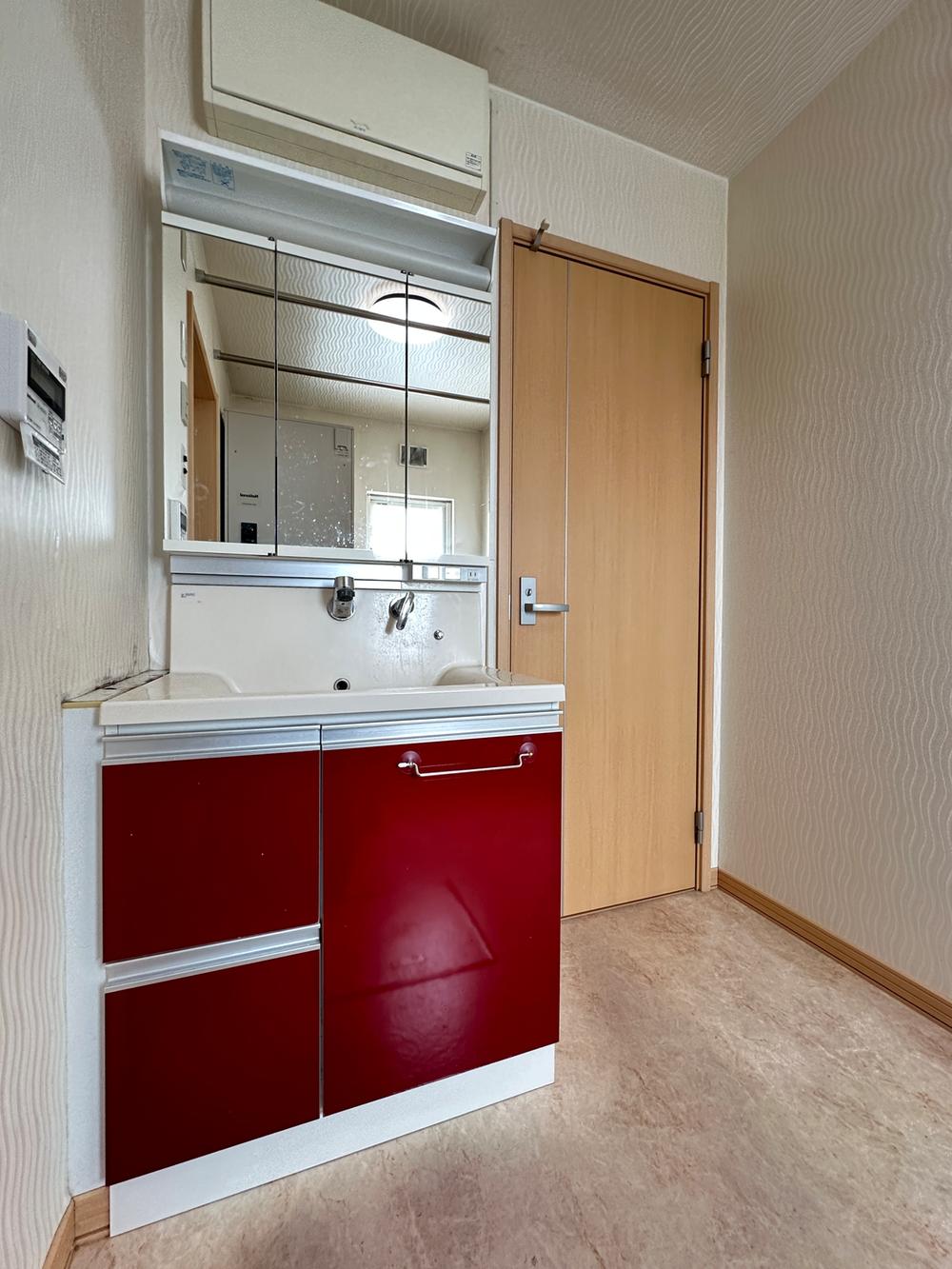 【洗面台】ワイドミラーが付いた高機能な洗面化粧台。比較的広いスペースが確保されており、朝の忙しい時間でも混雑することなくご支度ができます!キッチンと繋がっている、家事のしやすい間取りです。