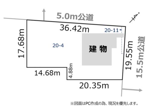 | 私道負担・道路 | - | 接道状況 | 東 15.5m 公道 接面19.5m北 5.0m 公道 接面36.4m | ||