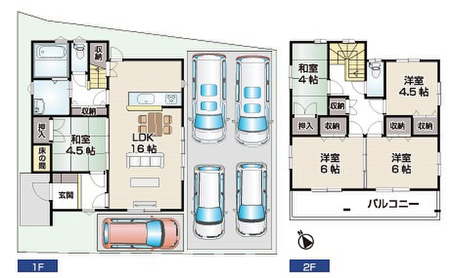 | 建物構造 | 木造/2階建 | 間取り詳細(帖) | リビングダイニングキッチン 16帖(1階)和室 4.5畳(1階)洋室 4.5帖(2階)和室 4畳(2階)洋室 6帖(2階)×2 | ||